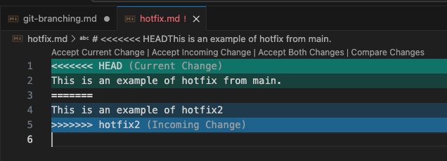 In order to resolve the conflict, you have to choose one side or the other or merge the contents yourself. For example, here I changed the content of the hotfix.md file from main branch, committed the changes and merged again.