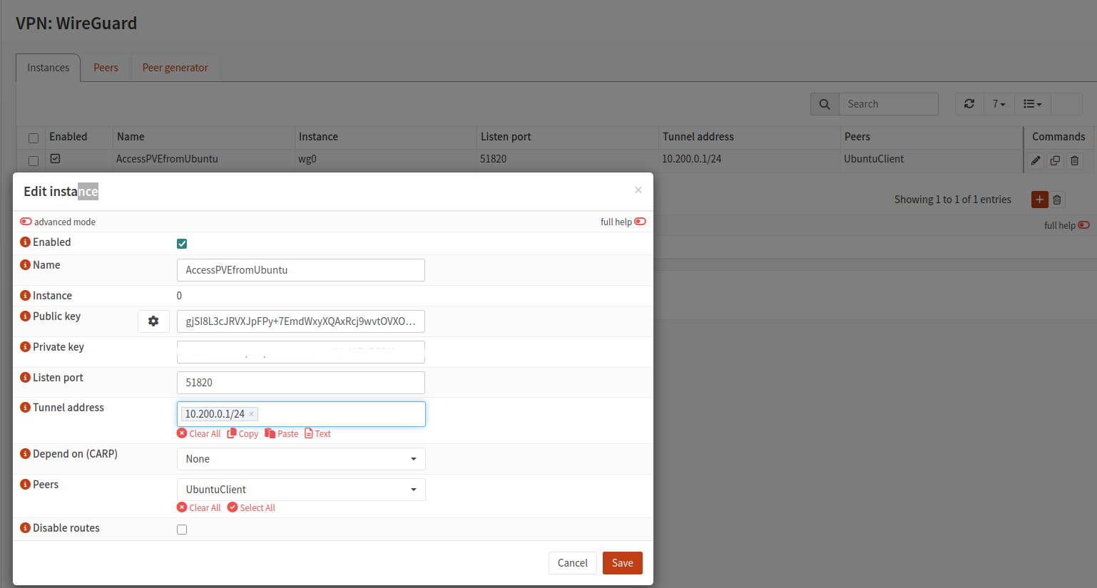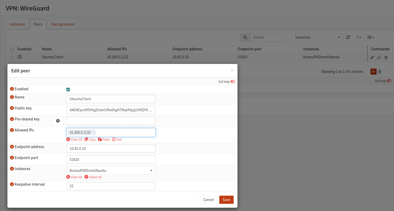 [Interface] PrivateKey = <server_private.key content> # ubuntu's private key Address = 10.200.0.1/24 ListenPort = 51820 [Peer] PublicKey = <OPNsense client public key> PresharedKey = <OPNsense preshared key> AllowedIPs = 192.168.100.0/24, 10.200.0.0/24 Endpoint = 10.42.0.10:51820 PersistentKeepalive = 15