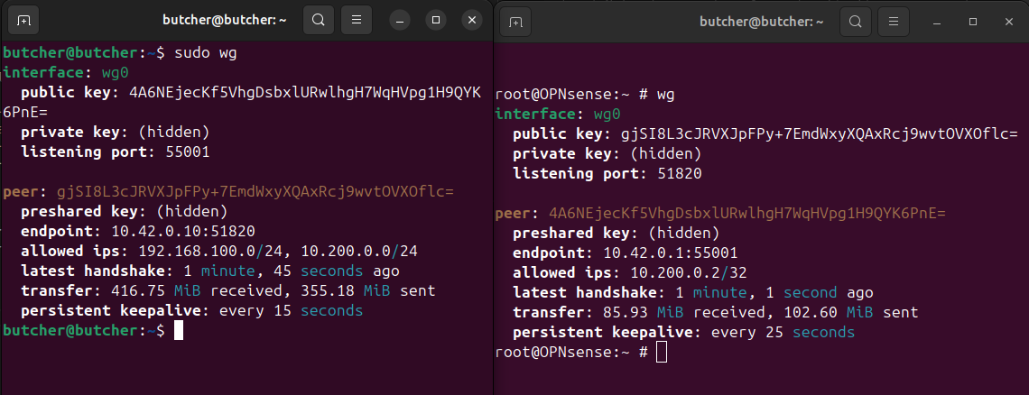 Here is the WireGuard setting, left terminal is my Ubuntu (client) and right terminal is OPNsense (WireGuard instance is running on it).
